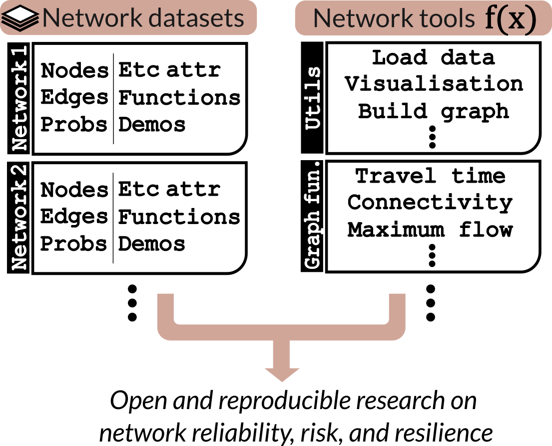The repository serves two purposes (cf Figure 1): (1) to provide a standardised collection of benchmark network datasets, and (2) to offer ready-to-use system performance functions compatible with network data for probabilistic assessments.